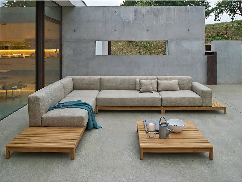 Odolnosť pre vonkajšie prostredie – teak a kvalitné outdoor materiály zaručujú, že sedačka odolá slnku, vlhkosti aj bežnému opotrebeniu, vhodná na celoročné vonkajšie použitie.