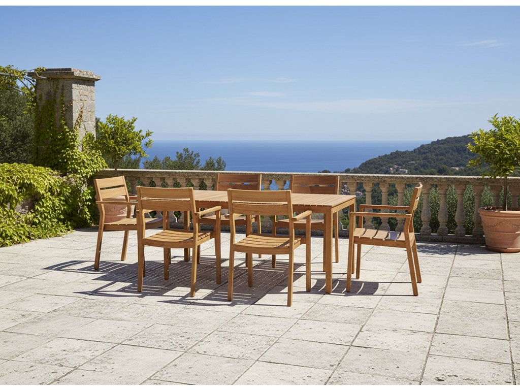 Tento klasický jedálenský stôl je vyrobený z prémiového teakového dreva, ktoré je známe svojou odolnosťou voči poveternostným vplyvom, dlhou životnosťou a prirodzenou krásou. Teak časom získava autentickú striebristo‑šedú patinu, no pri pravidelnej starostlivosti si zachováva aj svoj teplý zlatistý odtieň.