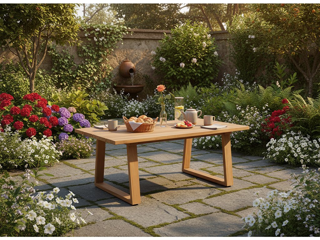 Masívna teaková doska s prirodzenou kresbou dreva dodáva stolu teplý a autentický charakter a zabezpečuje stabilitu a moderný kontrast k prírodnému materiálu. Teak je ideálnou voľbou pre exteriér – je odolný voči poveternostným vplyvom, má dlhú životnosť a časom môže získať krásnu striebristo-sivú patinu.