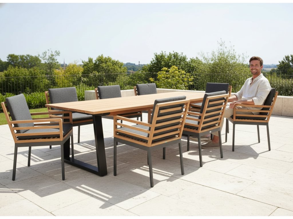 Čisté línie a elegantná kombinácia čierneho hliníkového rámu a teakového dreva dodávajú stolu moderný a zároveň prírodný vzhľad.