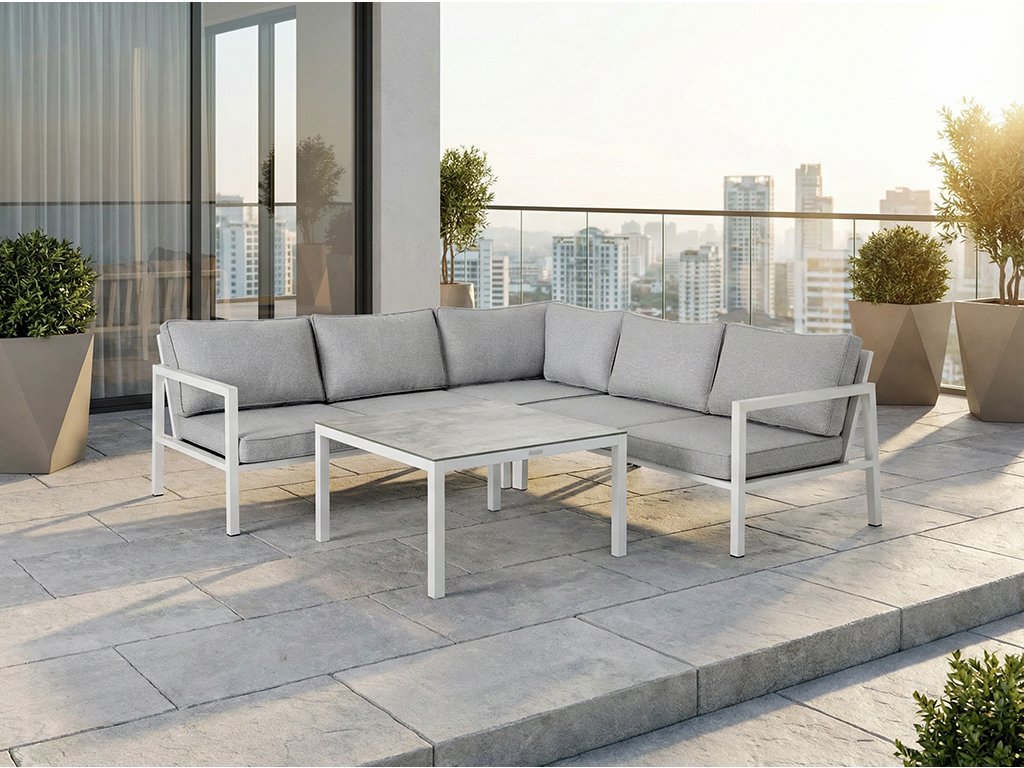 Sedačka Belfort je postavená na pevnom hliníkovom ráme, doplnenom šedou Textilene tkaninou a vankúšmi z olefínu, ktoré sú odolné voči UV žiareniu a vonkajším podmienkam. Tento materiál je zároveň ľahko udržiavateľný a vhodný pre vonkajšie prostredie.