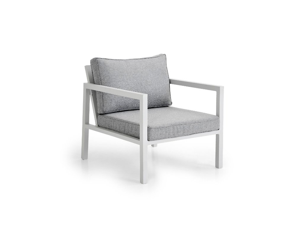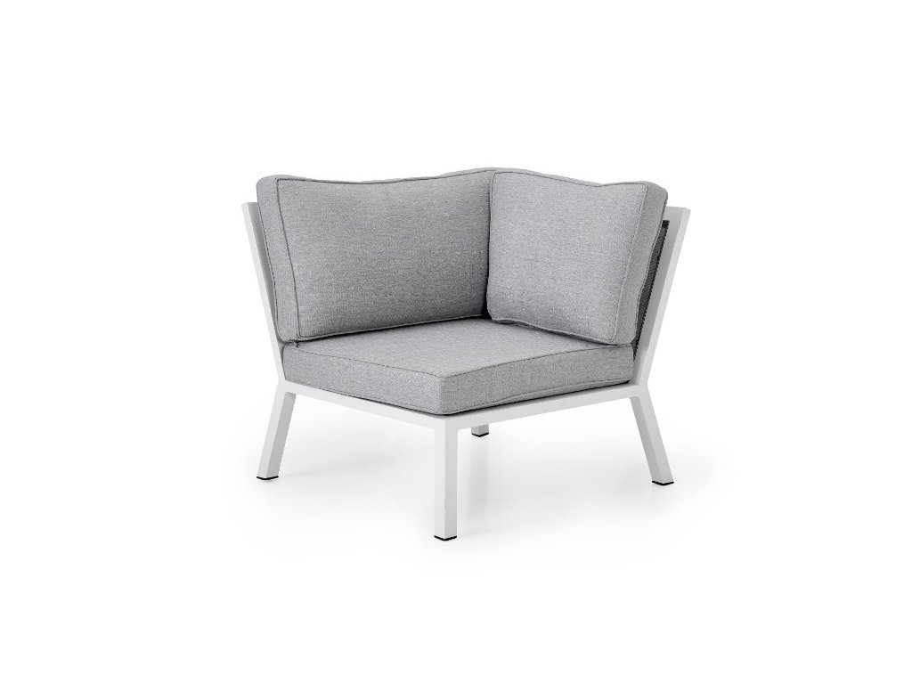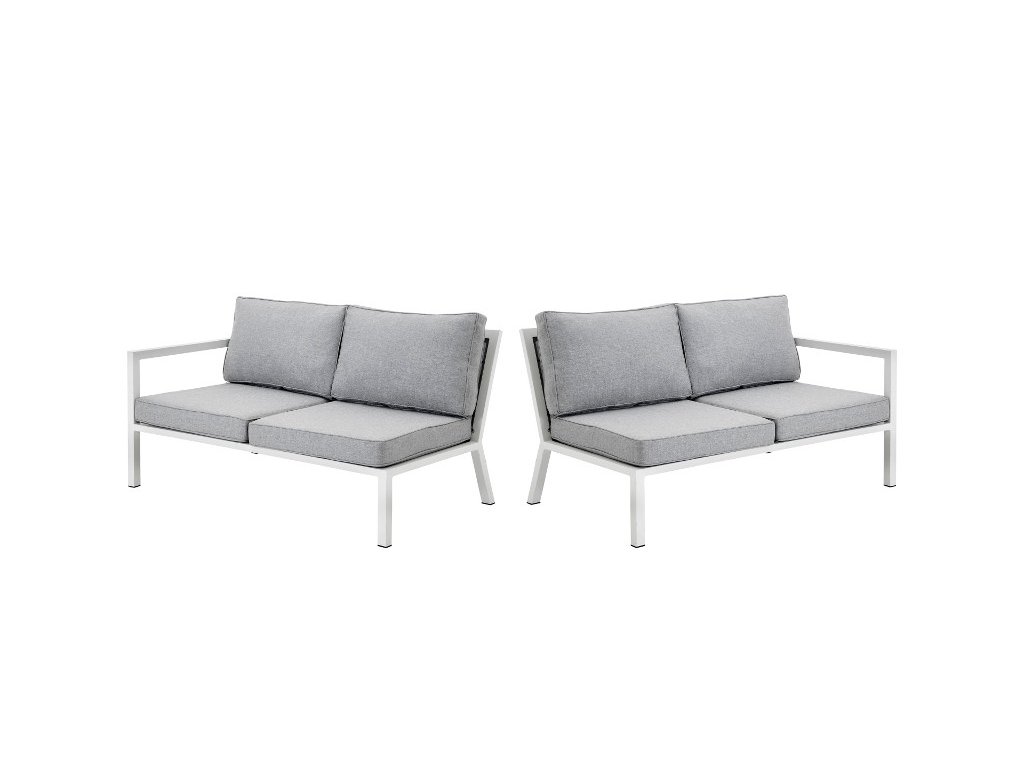 Sedačka Belfort je postavená na pevnom hliníkovom ráme v bielej farbe, doplnenom šedou Textilene tkaninou a vankúšmi z olefínu, ktoré sú odolné voči UV žiareniu a vonkajším podmienkam. Tento materiál je zároveň ľahko udržiavateľný a vhodný pre vonkajšie prostredie.