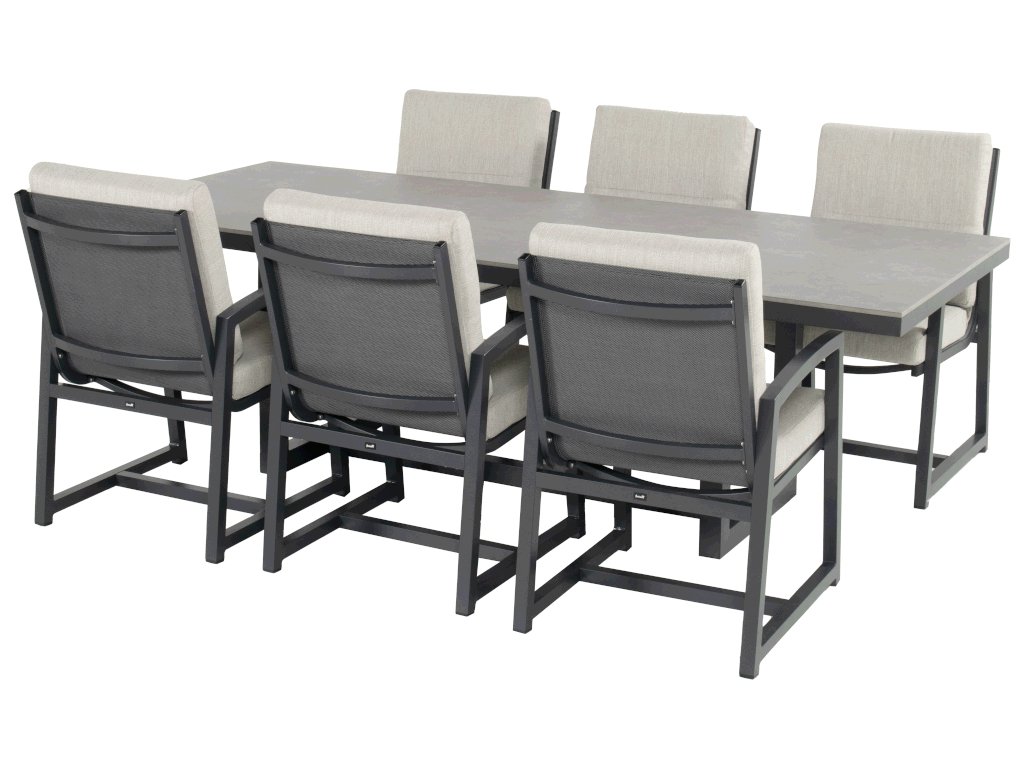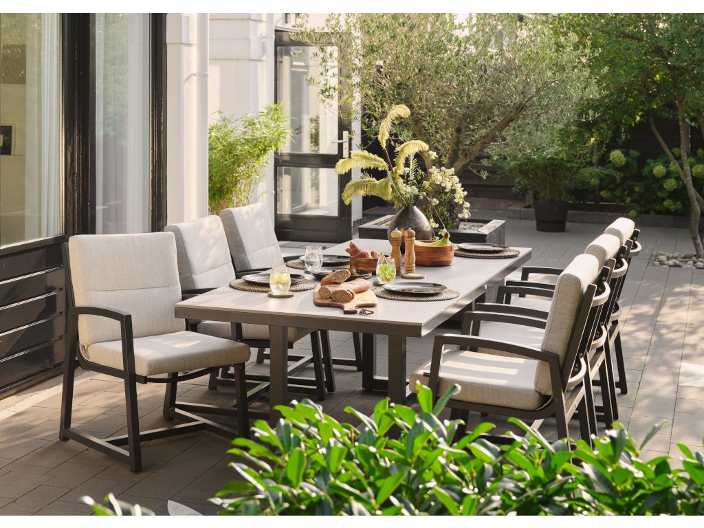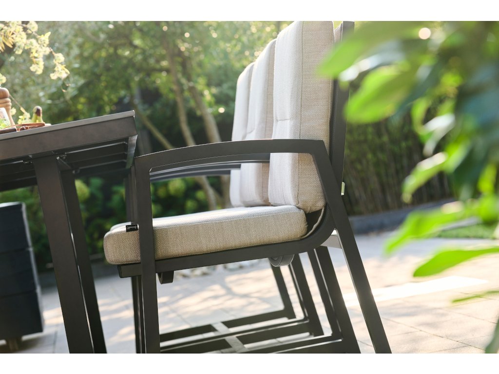 - Hliníková konštrukcia: Nábytok je vyrobený z kvalitného hliníka v antracitovej farbe, čo zaisťuje moderný vzhľad a odolnosť voči poveternostným vplyvom.