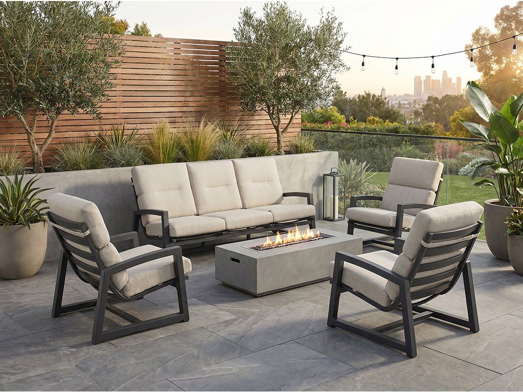 Súprava obsahuje 2 kreslá, 1 lavicu pre 3 osoby a kávový stolík (140 × 75 × 45 cm), takže poskytuje ideálne miesto na rodinné posedenia, spoločné rozhovory či relax s priateľmi. Polstrovanie je šité na mieru a rýchloschnúce, takže zostáva pohodlné aj po daždi.