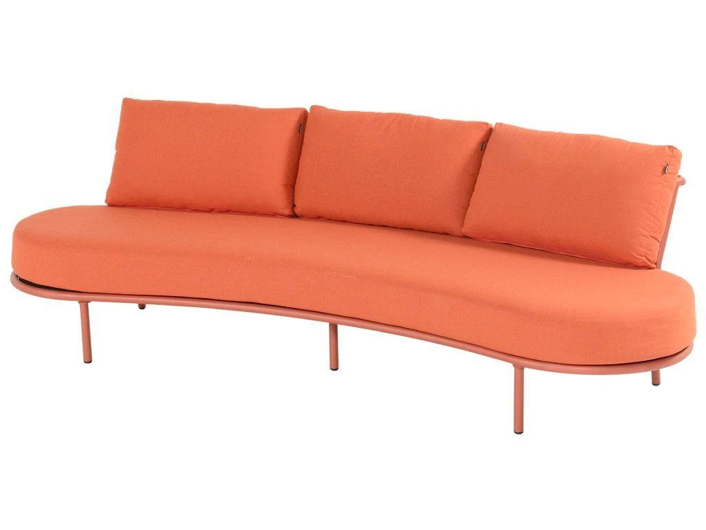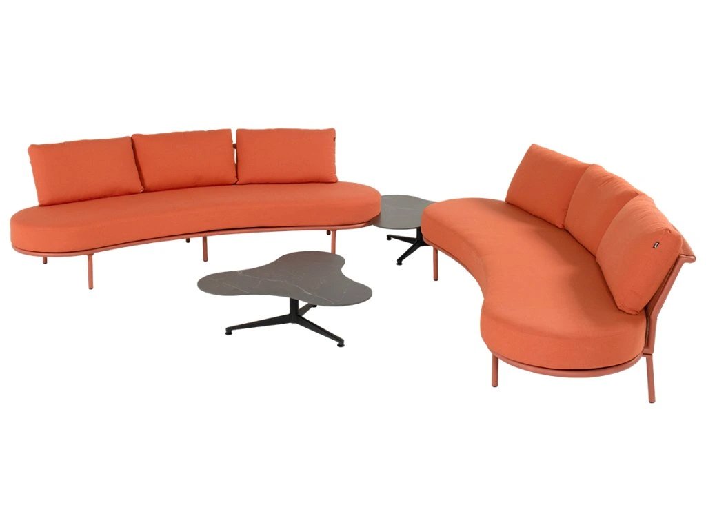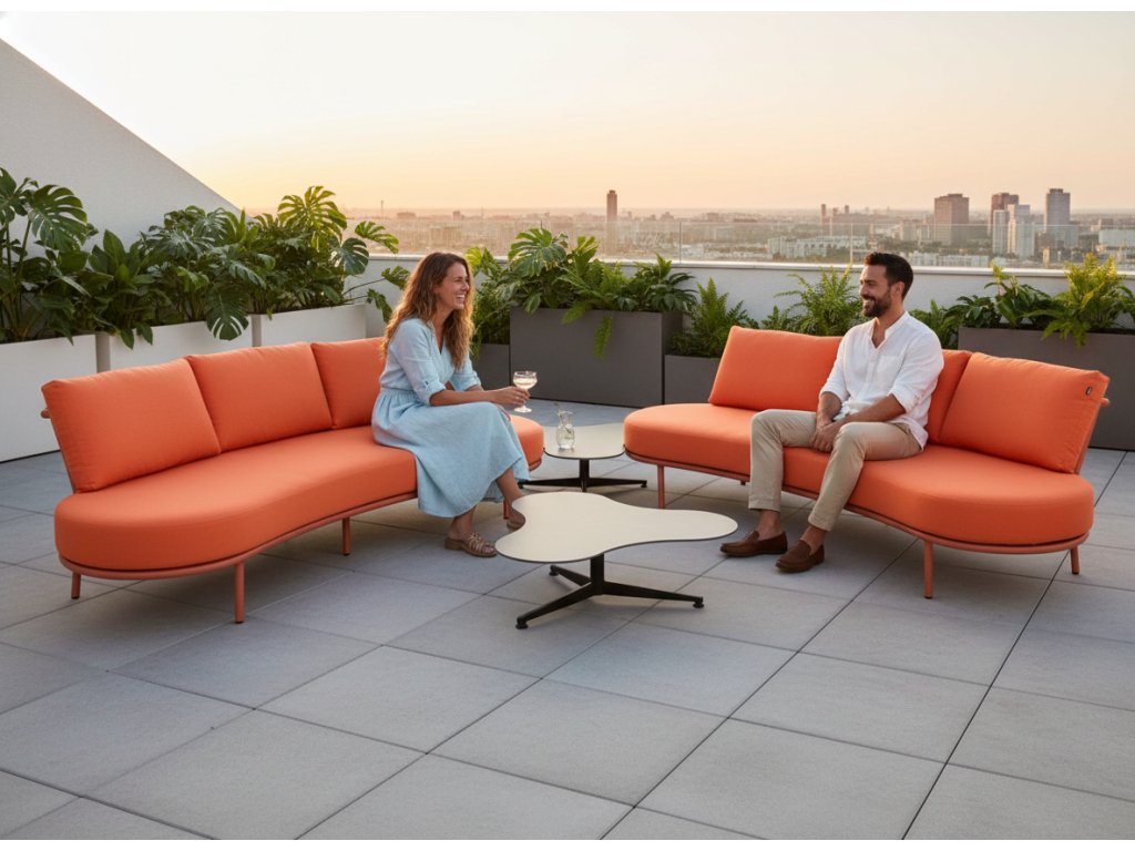 Súprava zaujme na prvý pohľad svojimi oblými tvarmi a nízkym lounge profilom, ktorý pôsobí uvoľnene, no zároveň veľmi elegantne. Polstrovanie vo farbe terracotta dodáva priestoru teplo, energiu a moderný stredomorský nádych. Je to farba, ktorá krásne kontrastuje s architektúrou aj zeleňou.