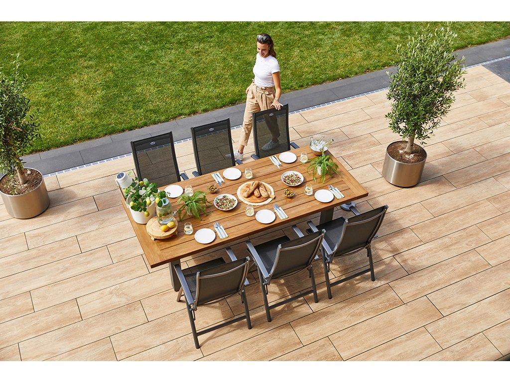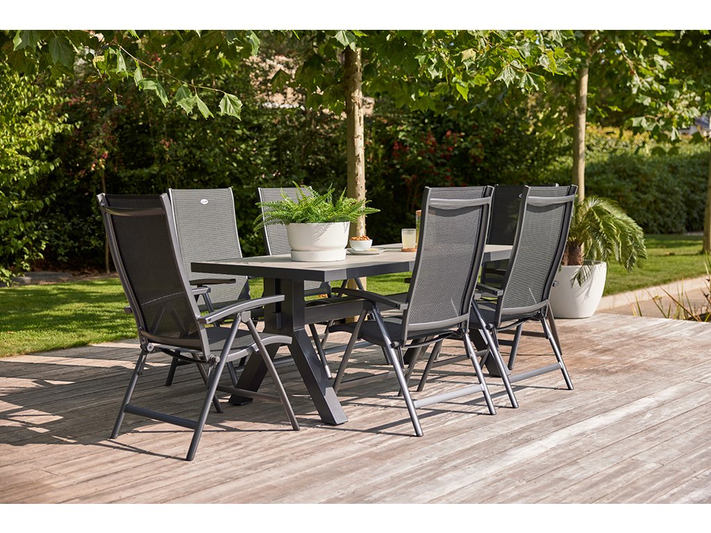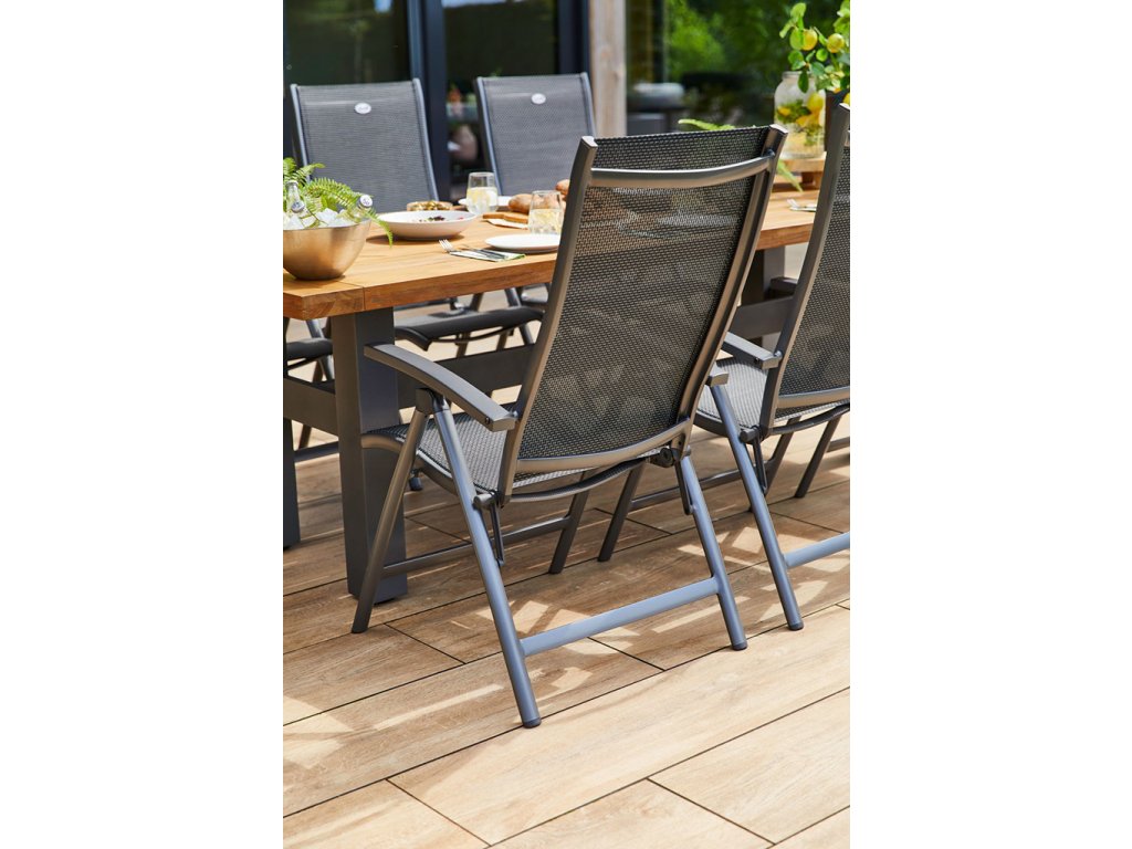 Tmavosivý vzhľad robí z tejto stoličky univerzálny prvok, ktorý sa ľahko kombinuje s rôznymi typmi záhradného nábytku – či už ide o minimalistické zostavy, moderné lounge sety alebo doplnkové kreslá pri jedálenskom stole.