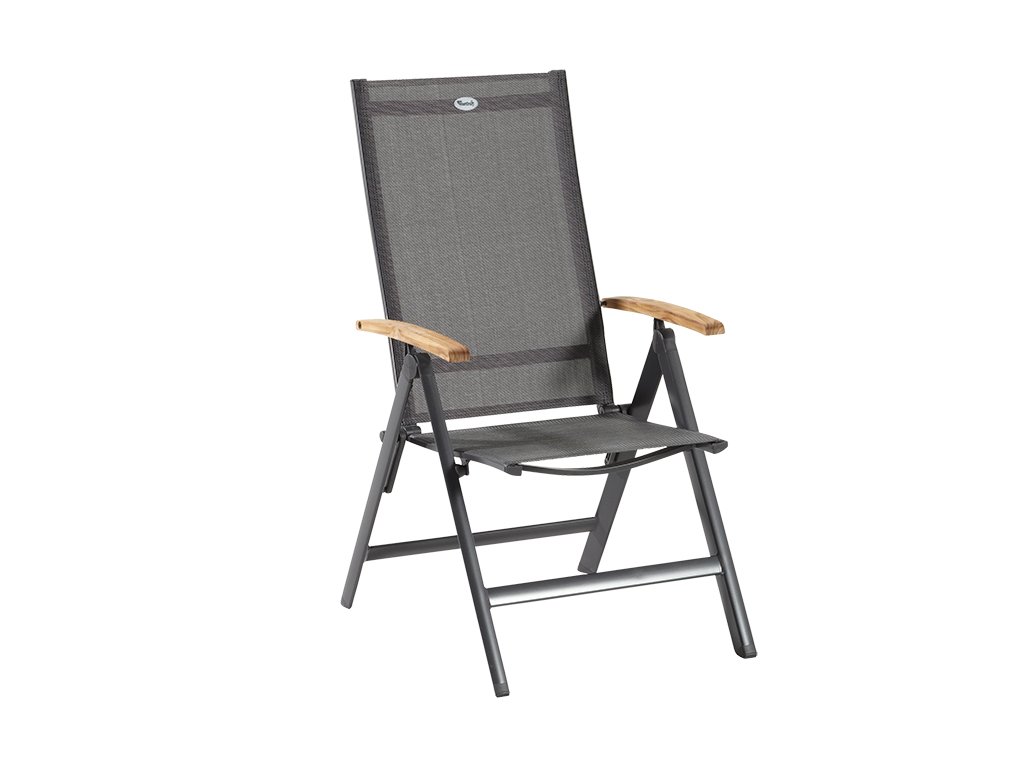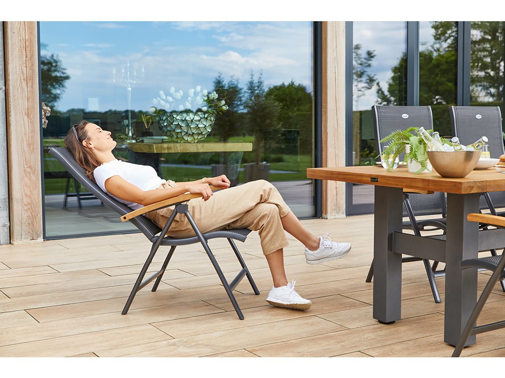 Kombinácia antracitového hliníkového rámu, textilénu a teaku vytvára harmonický a nadčasový vzhľad, ktorý sa hodí ku väčšine záhradných stolov a kompletov.