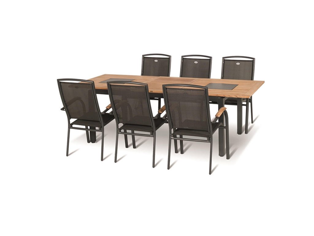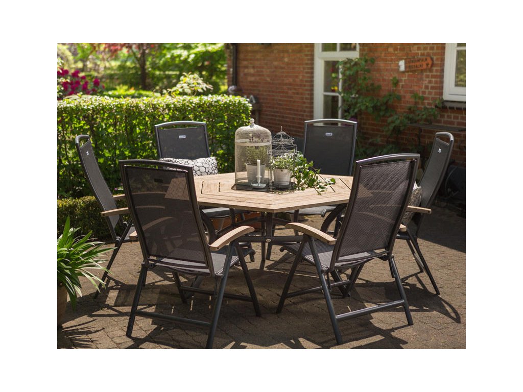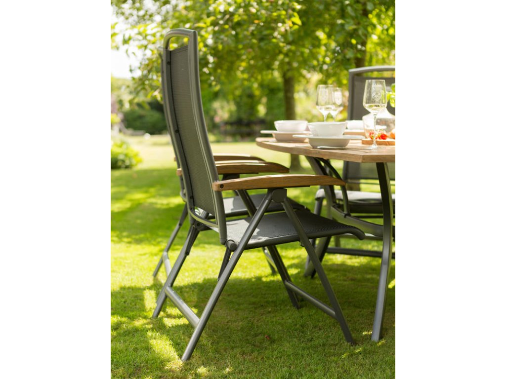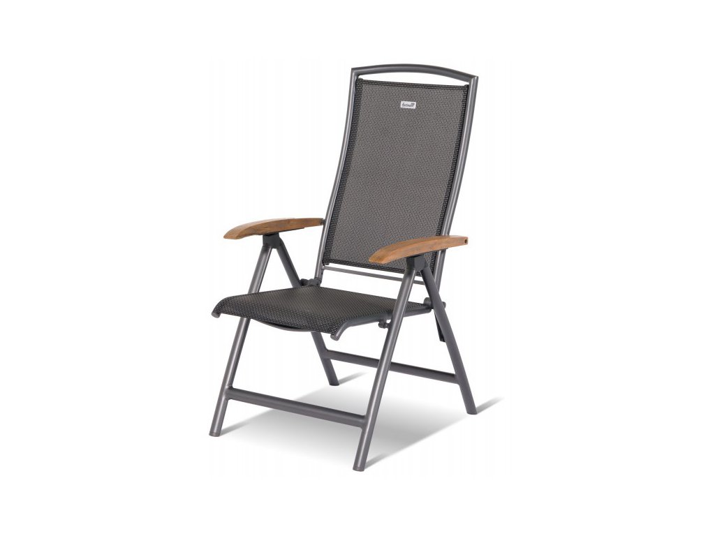 Záhradná polohovateľná stolička z hliníkovej kolekcie Hartman. Podrúčky sú osadené kvalitným teakovým drevom. Stolička má ľahké polohovanie a skladanie vďaka kvalitnému kovaniu.
