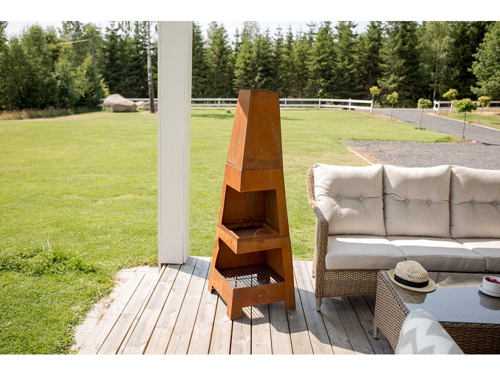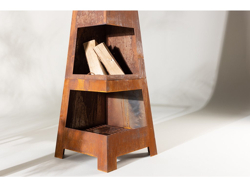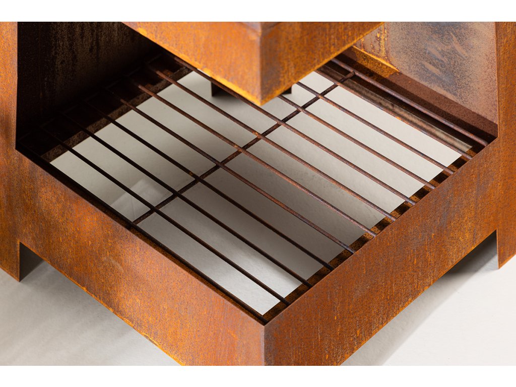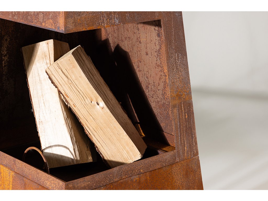 Konštrukcia z ocele odolnej voči vysokým teplotám zaručuje pevnosť a dlhú životnosť. Povrch s prirodzeným „rust“ efektom je navrhnutý pre vonkajšie použitie a skvele zapadne do moderných aj prírodných exteriérov.