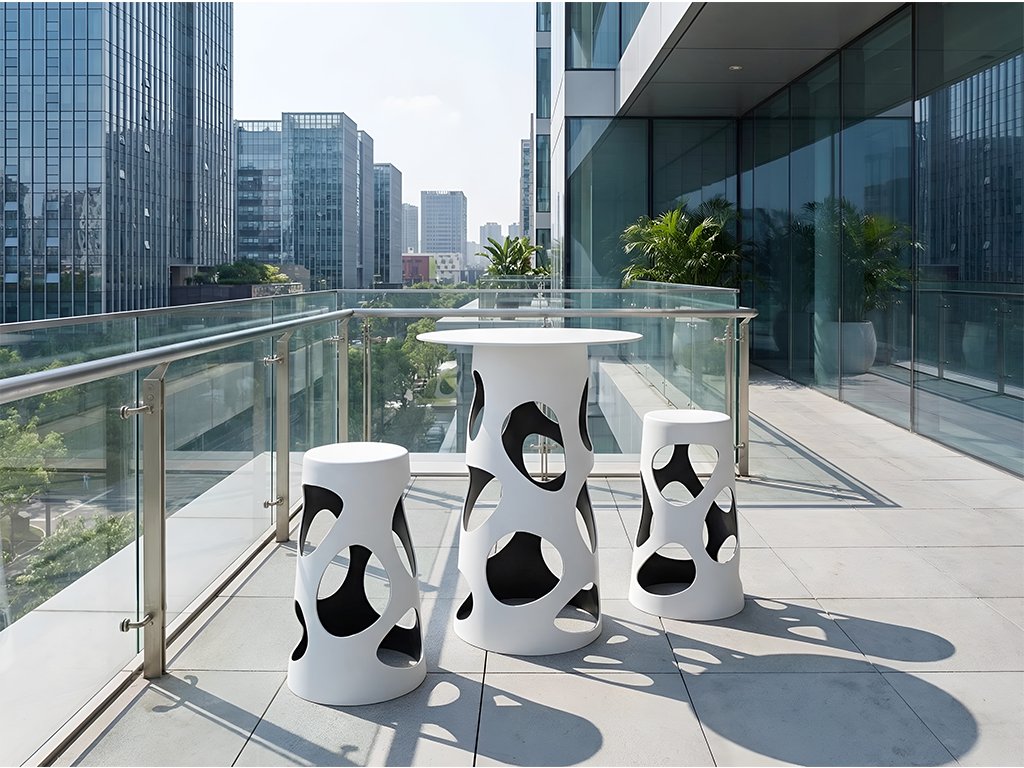 Elegantná HPL doska stola dopĺňa moderný charakter a poskytuje odolnú plochu ideálnu na drinky, kávu alebo malé občerstvenie.