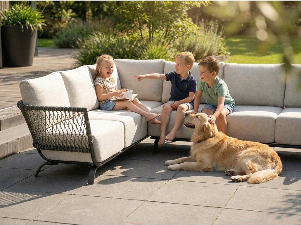 Kvalitné textilné vankúše a sedáky v jemnej béžovej farbe poskytujú pohodlie aj pri dlhšom posedení. Materiál je odolný voči UV žiareniu, vlhkosti a poveternostným podmienkam.