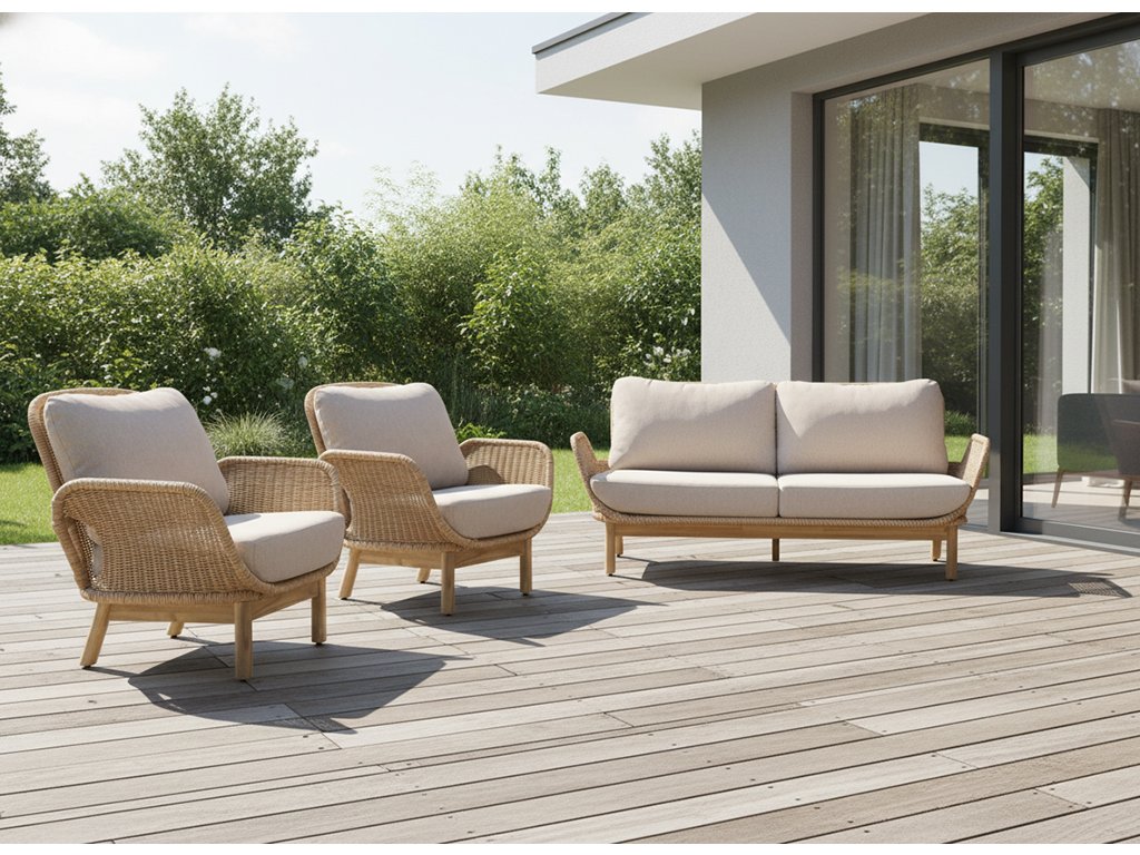 Súprava je vyhotovená z pevného hliníkového rámu, prepleteného syntetického ratanu, ktorý je odolný voči poveternostným vplyvom, a doplnená o teakové nohy pre teplý prírodný akcent. Tento mix materiálov pôsobí elegantne a zároveň je vhodný do exteriéru – odolá dažďu aj slnečnému žiareniu a zaručuje dlhotrvajúcu krásu nábytku.