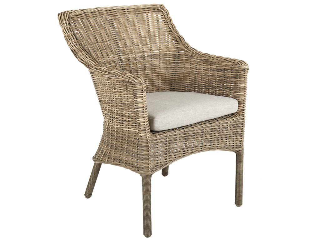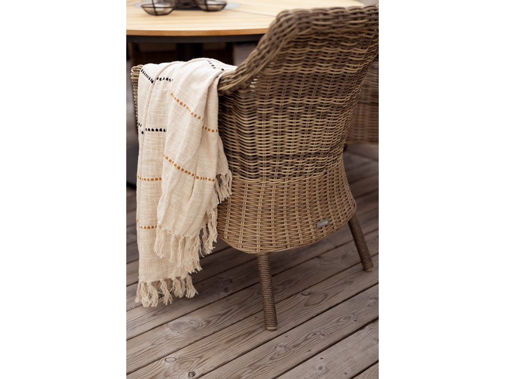 Celkový vzhľad kresla pôsobí útulne a nadčasovo. Výplet zo syntetického ratanu jemne imituje prírodnú štruktúru a spolu so svetlým odtieňom pôsobí prirodzene a harmonicky v akejkoľvek outdoor zóne. Mäkký polyesterový vankúš sťahuje komfort na vyššiu úroveň a dodáva príjemný pocit pri sedení.
