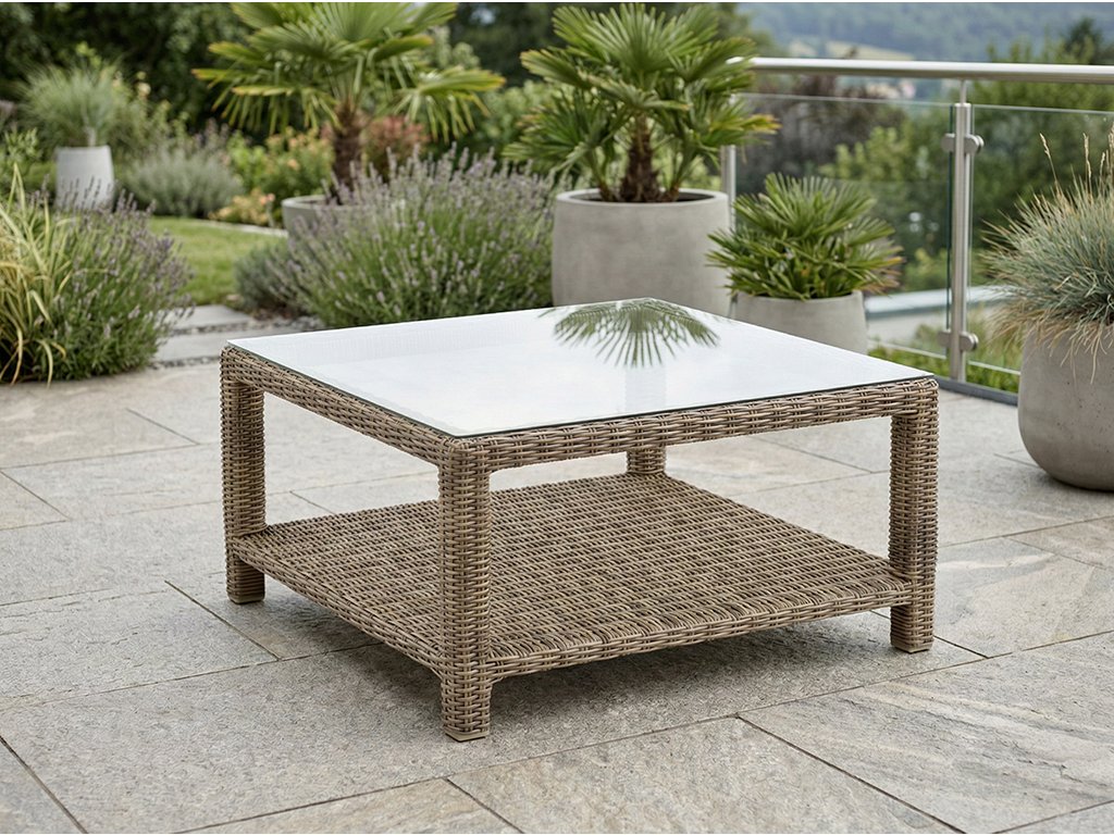 Stolík je vyrobený zo syntetického ratanu, ktorý verne imituje prírodný výplet, no zároveň ponúka vyššiu odolnosť voči poveternostným podmienkam. Vrchnú časť tvorí sklenená doska, ktorá zabezpečuje stabilný a ľahko udržiavateľný povrch – ideálny na kávu, dezert či letné osvieženie.