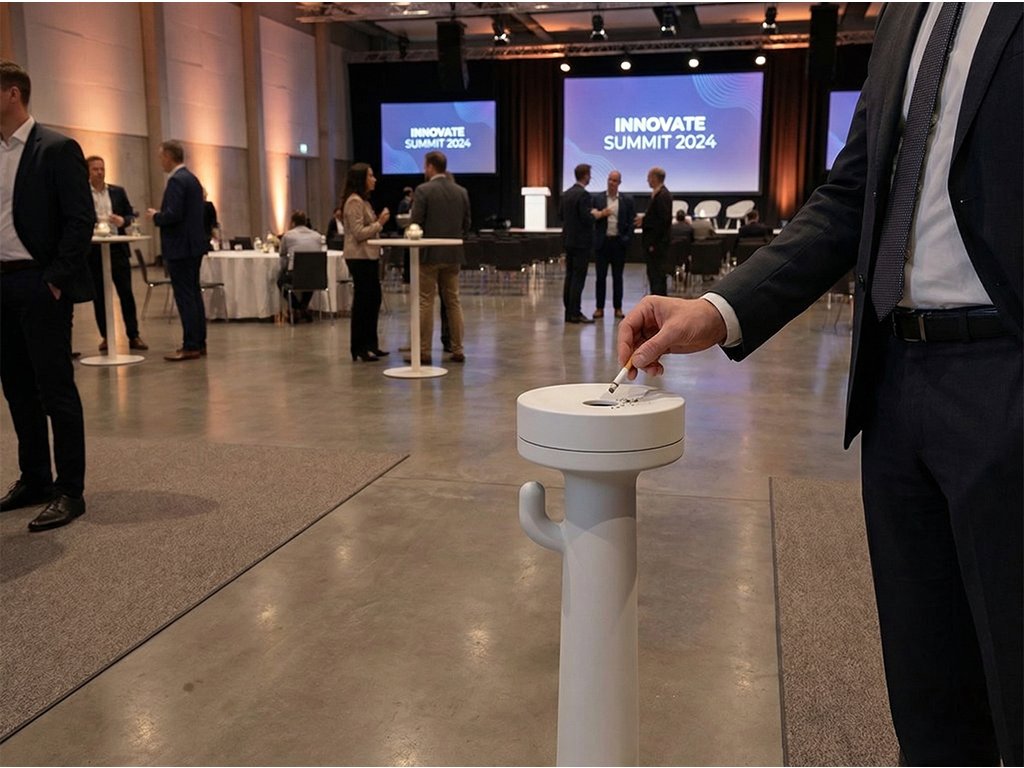 dizajnový vymedzovací stĺpik s popolníkom – funkčný prvok, ktorý spája označovacie riešenie priestoru s praktickým popolníkom pre vonkajšie priestory;
