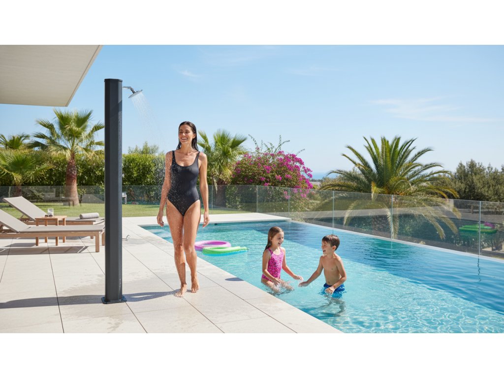 - Materiál a ochrana: Vyrobená z odolného hliníka, ktorý zaisťuje dlhú životnosť a vysokú odolnosť voči poveternostným vplyvom. Hliník je ľahký, ale pevný materiál, ktorý je tiež odolný voči korózii, čo zaručuje, že sprcha si zachová svoj pôvodný vzhľad aj po dlhodobom vystavení slnečnému žiareniu.