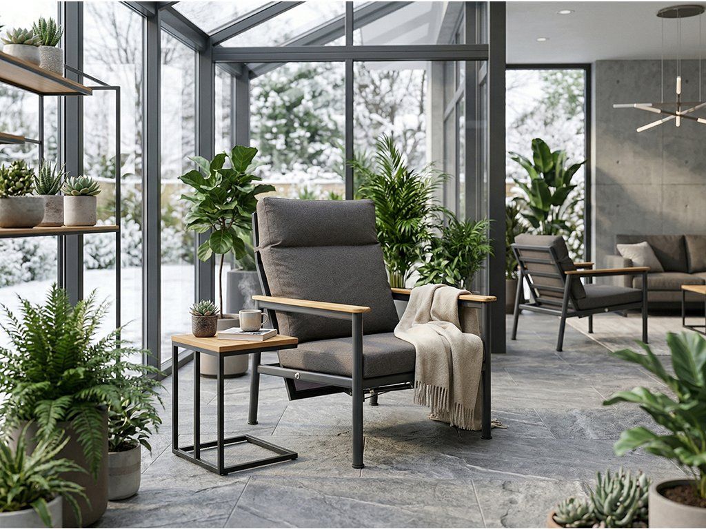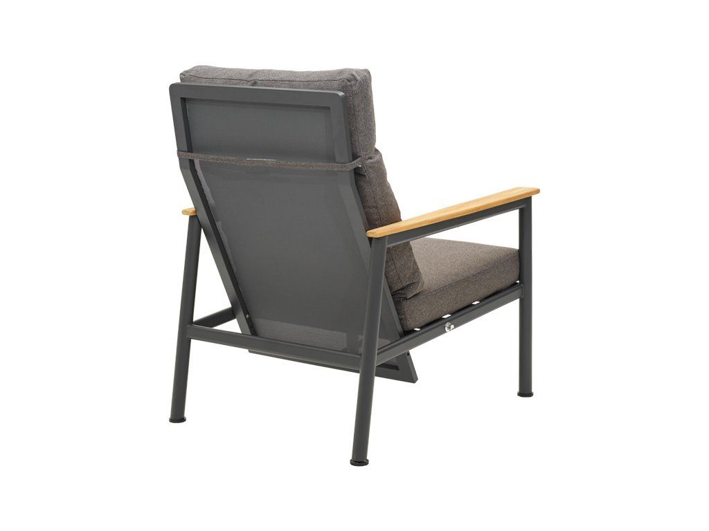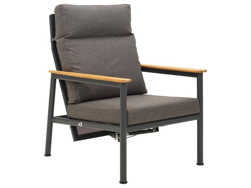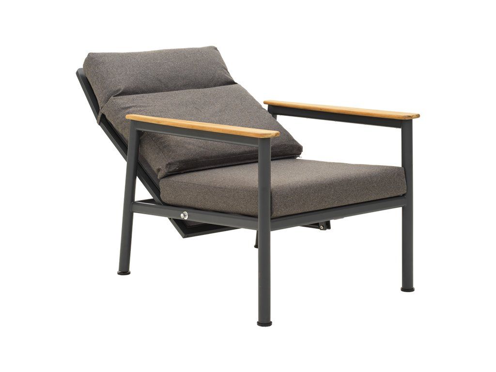 Minimalistická hliníková konštrukcia v antracitovej farbe pôsobí moderne a čisto, zatiaľ čo podrúčky z teakového dreva dodávajú kreslu prirodzené teplo a exkluzívny vzhľad. Kombinácia farieb Anthracite/Soft Dawn zapadne do každého štýlového exteriéru.