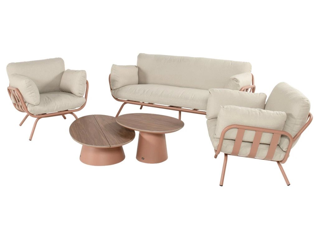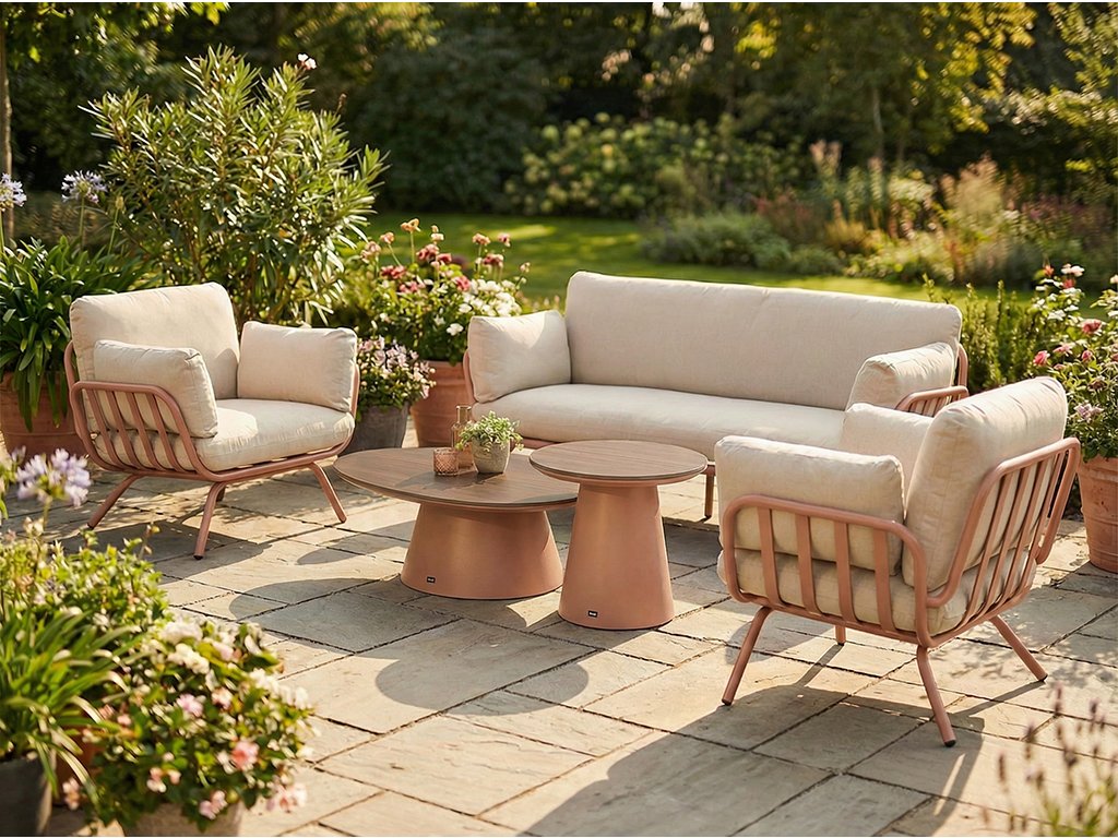 Základom súpravy je pevný hliníkový rám v štýlovej farbe tehlová mocha, ktorý je ľahký, stabilný a odolný voči poveternostným vplyvom. Pohodlie zabezpečujú mäkké textilné polstre z polyesteru so silikónovou výplňou, ktoré ponúkajú príjemnú oporu a vysoký komfort aj pri dlhšom sedení.