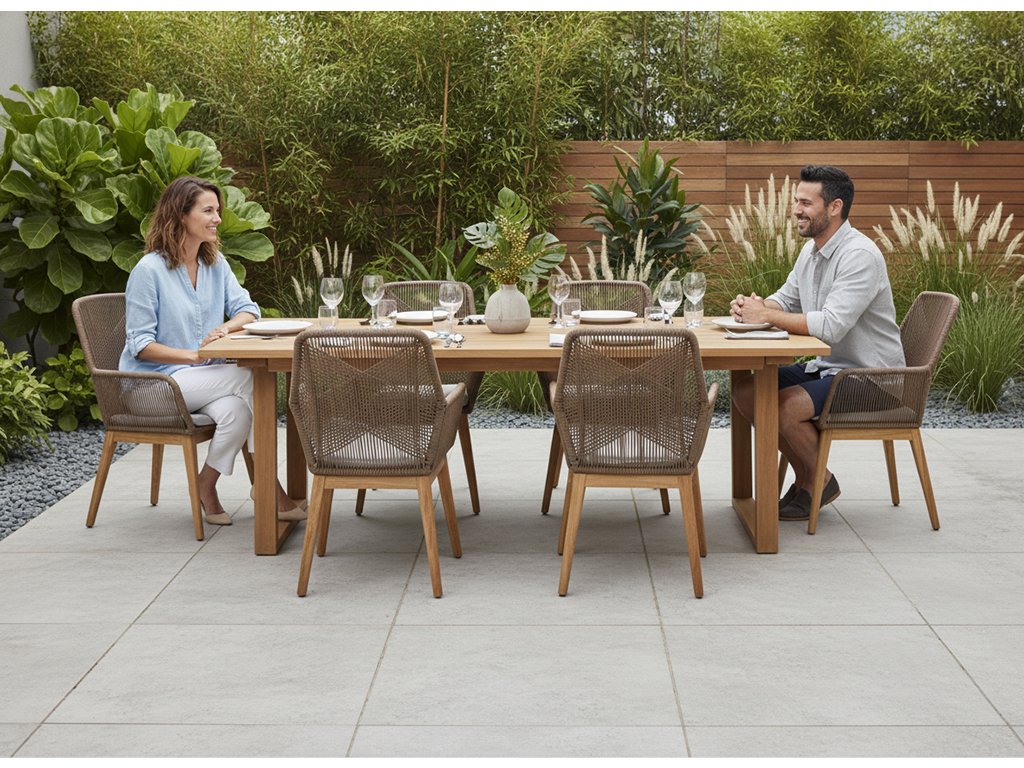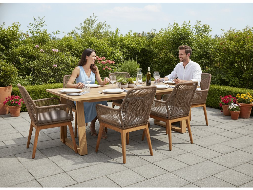 Telo stoličky tvorí pevná konštrukcia z prvotriedneho teakového dreva, známeho svojou vysokou trvácnosťou a prirodzenou odolnosťou voči poveternostným vplyvom. Elegantný výplet je vyrobený zo syntetického povrazu, ktorý je stabilný, pružný a nenáročný na údržbu. O maximálny komfort sa stará sedacia a operadlová výplň z kvalitného polyesteru s povrchovou úpravou „all weather“, takže si zachová farbu aj tvar aj pri častom vonkajšom používaní.